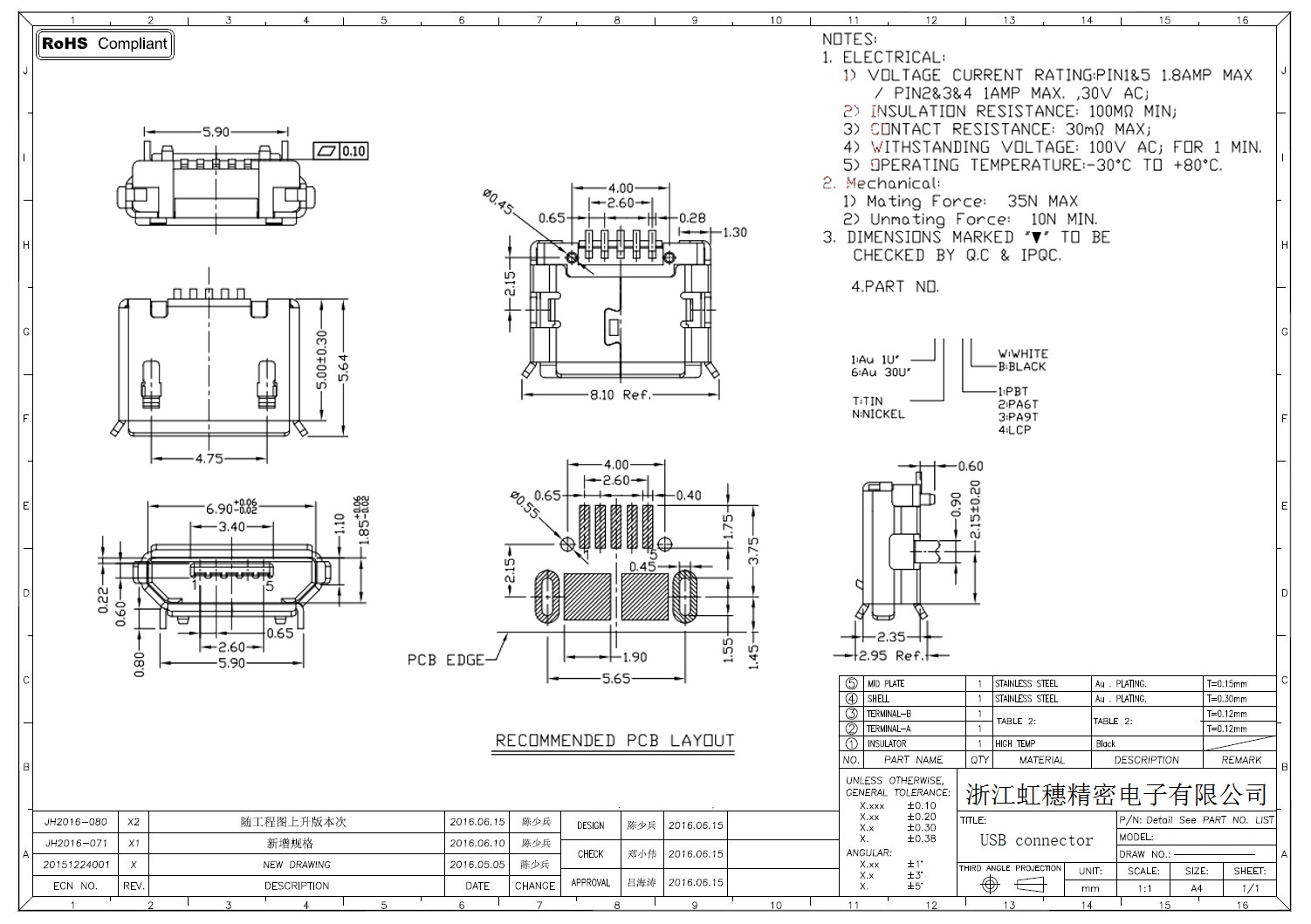 MICRO USB插座技術(shù)參數(shù):