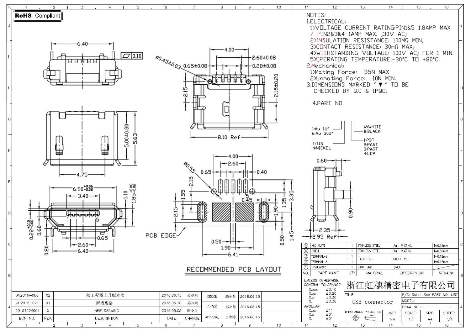 MICRO USB插座技術參數:
