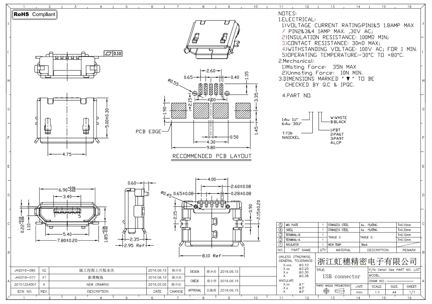 MICRO USB插座技術(shù)參數(shù):