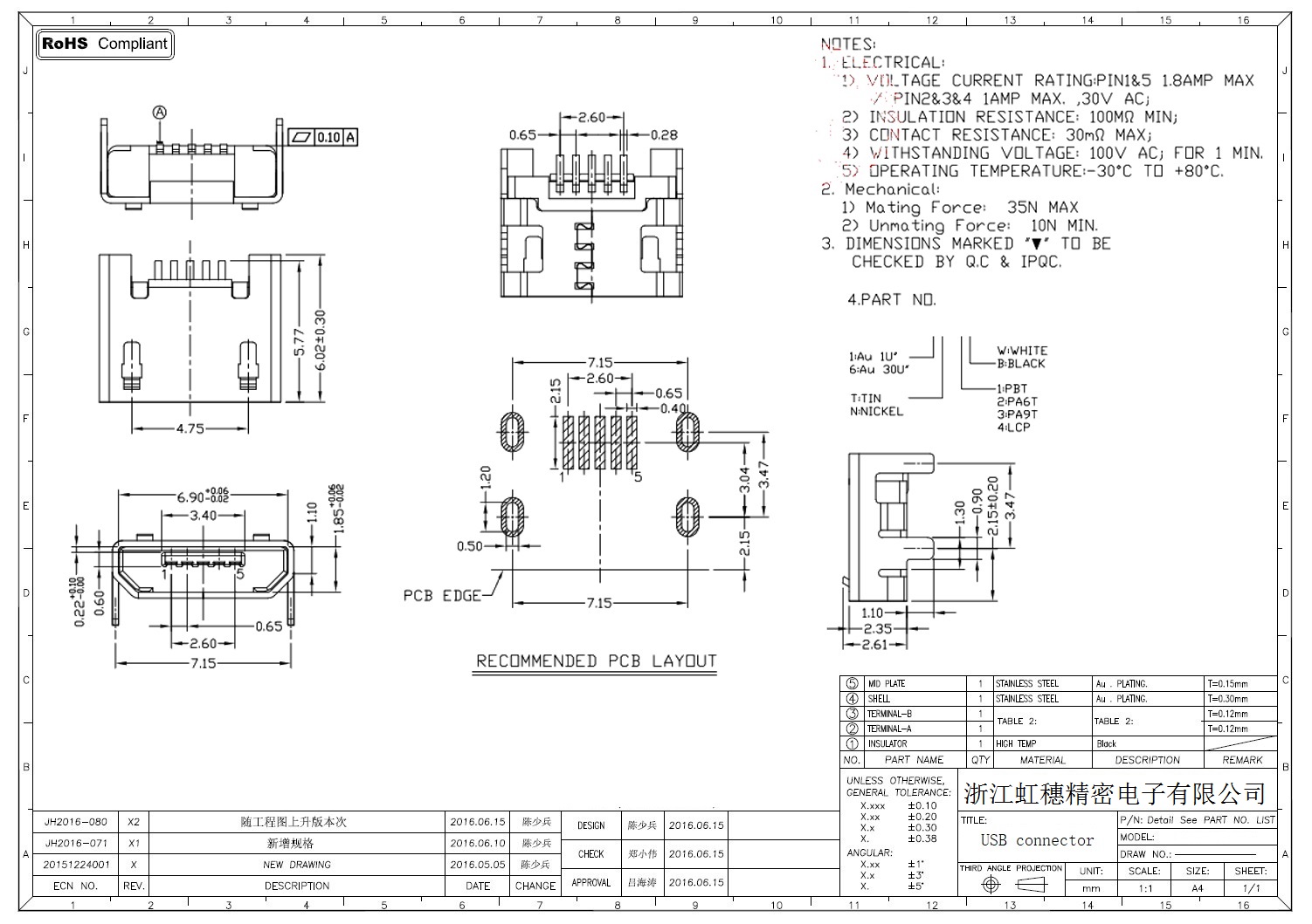 MICRO USB插座技術參數: