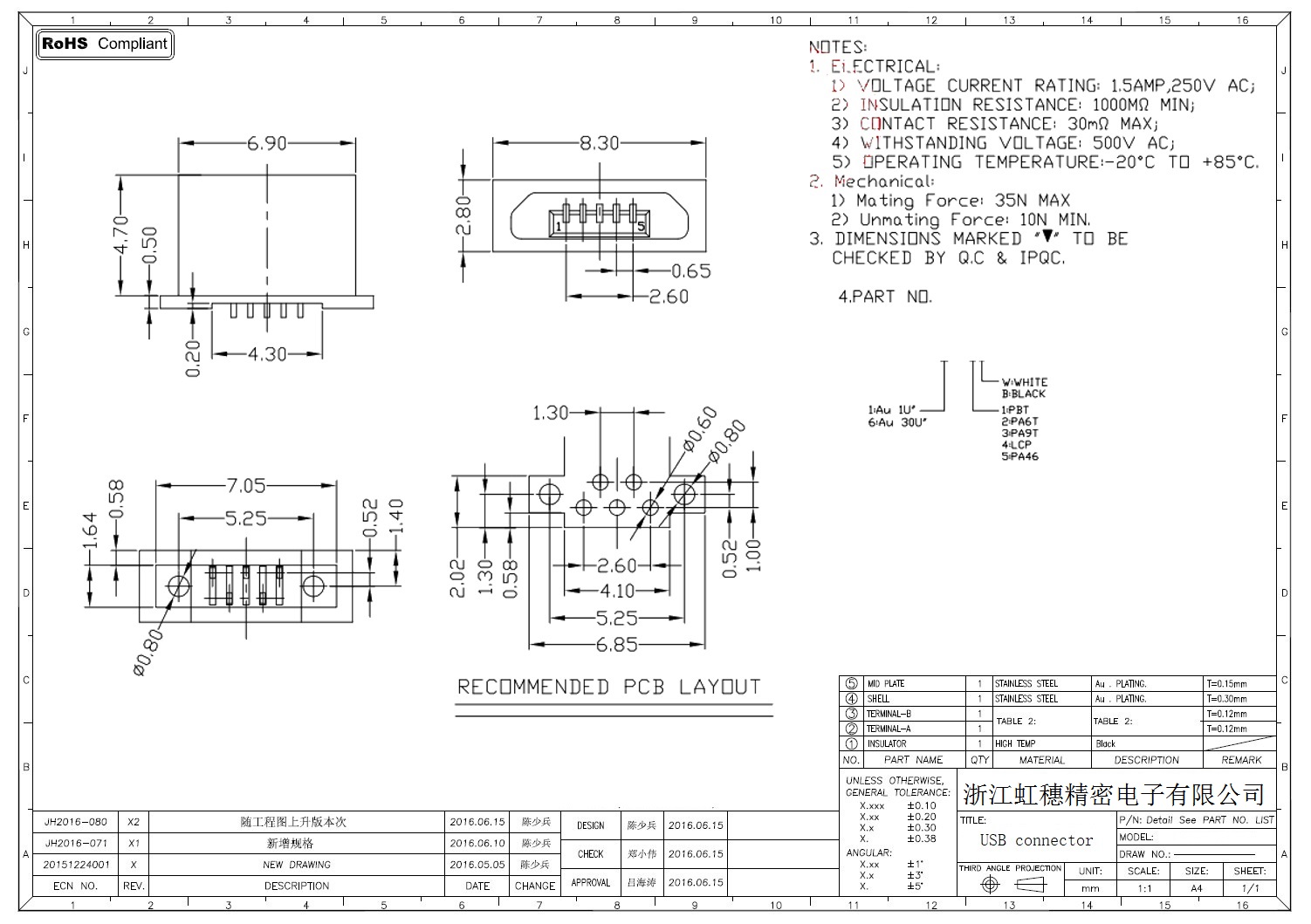 MICRO USB插座技術參數: