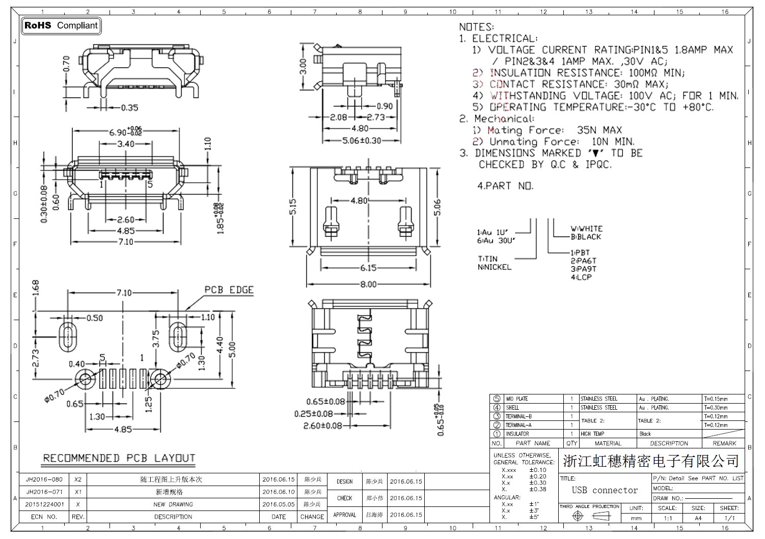 MICRO USB插座技術參數: