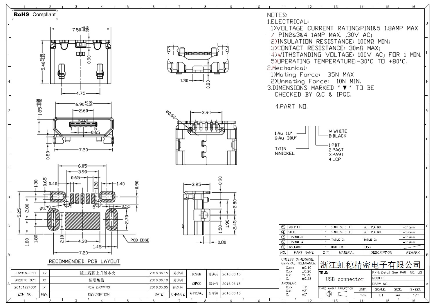 MICRO USB插座技術(shù)參數(shù):