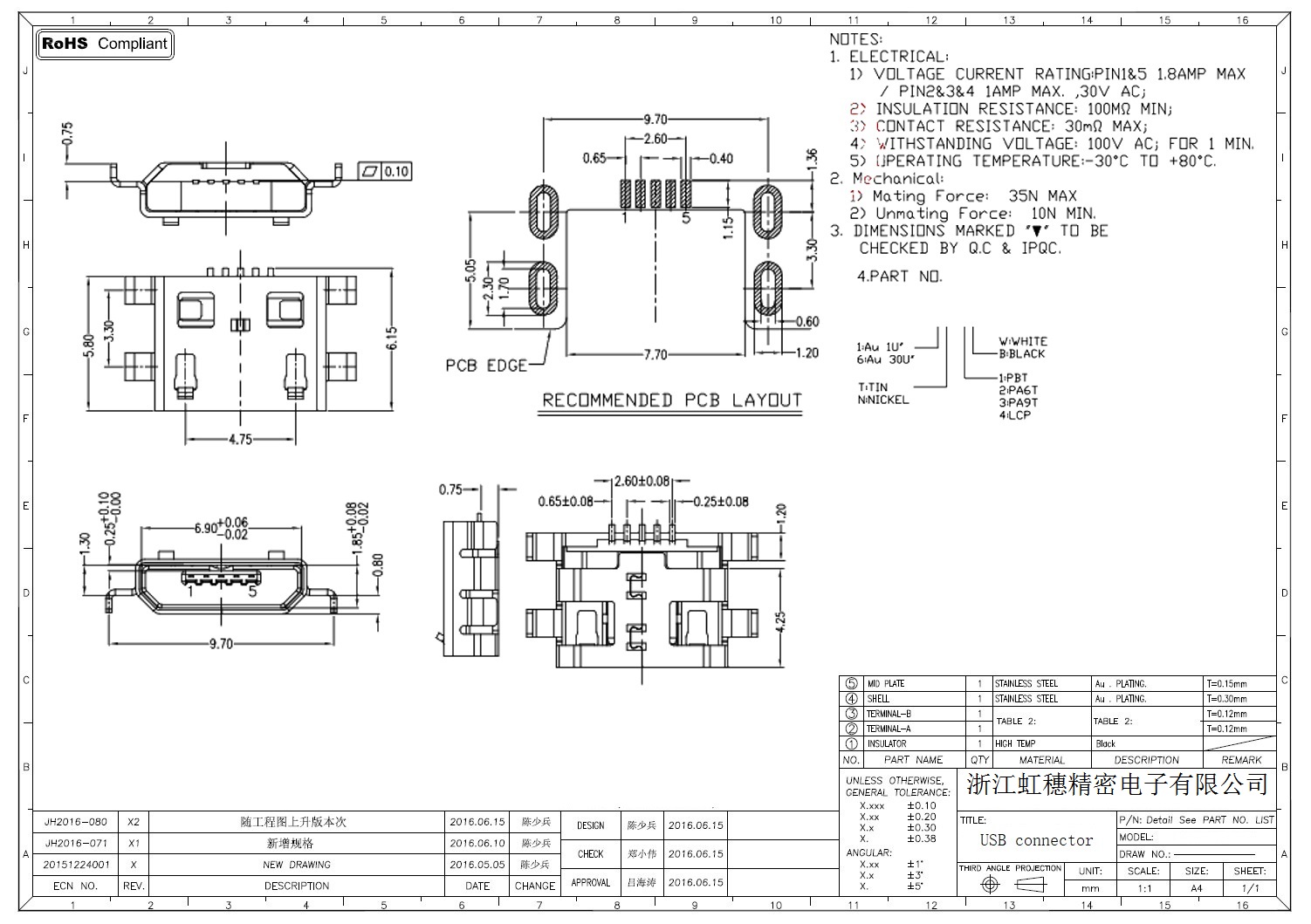 MICRO USB插座技術參數: