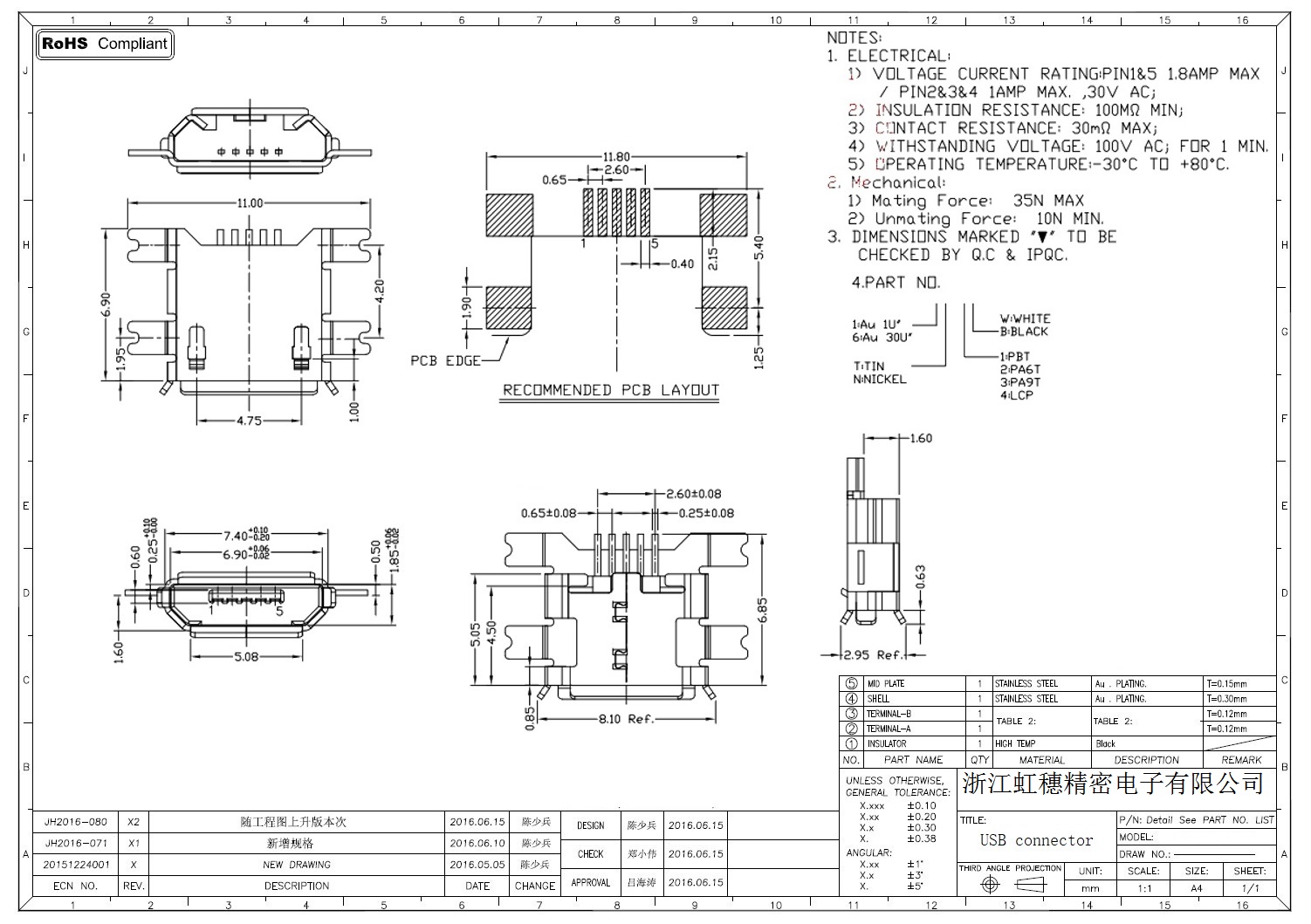 MICRO USB插座技術參數: