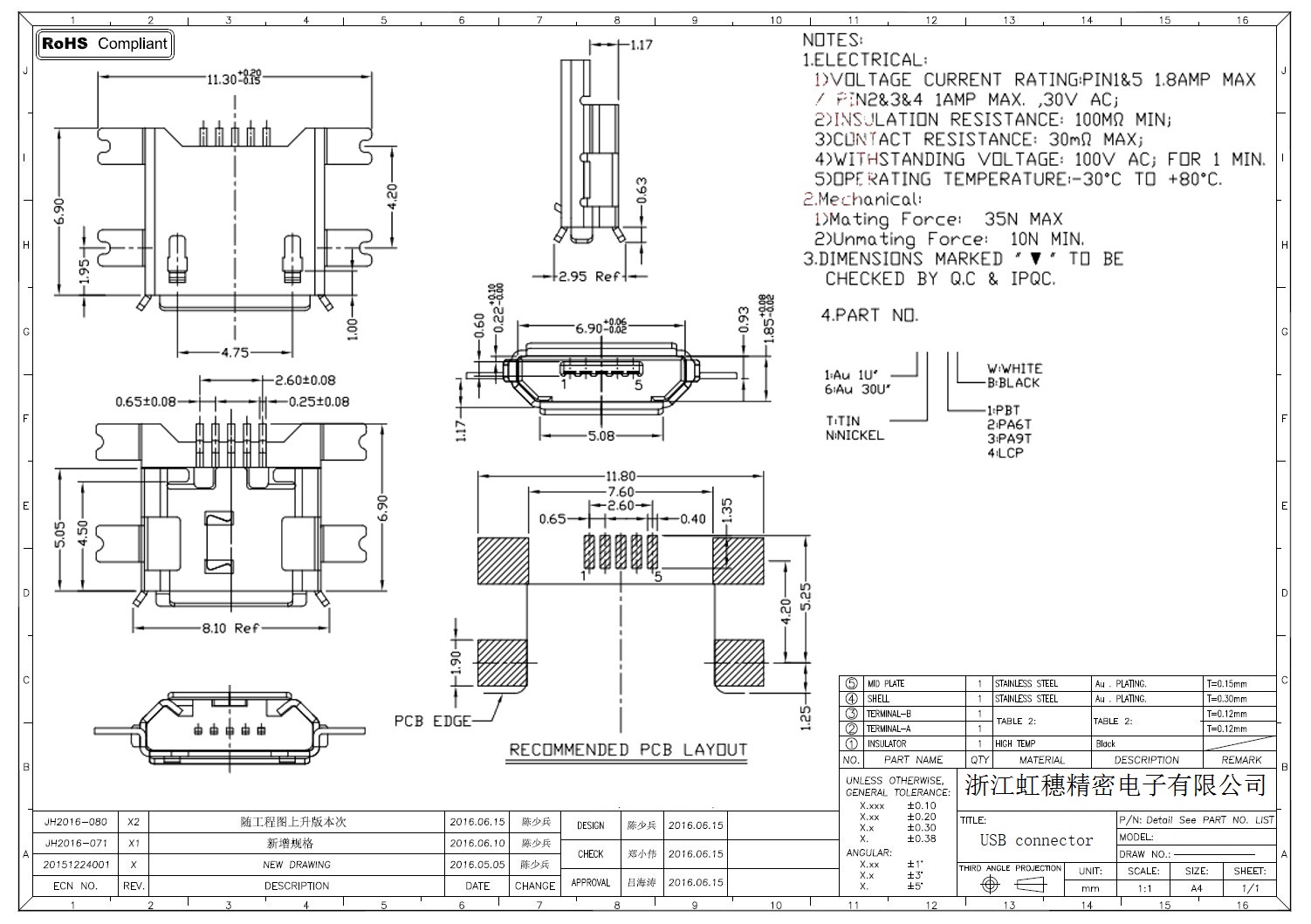 MICRO USB插座技術(shù)參數(shù):
