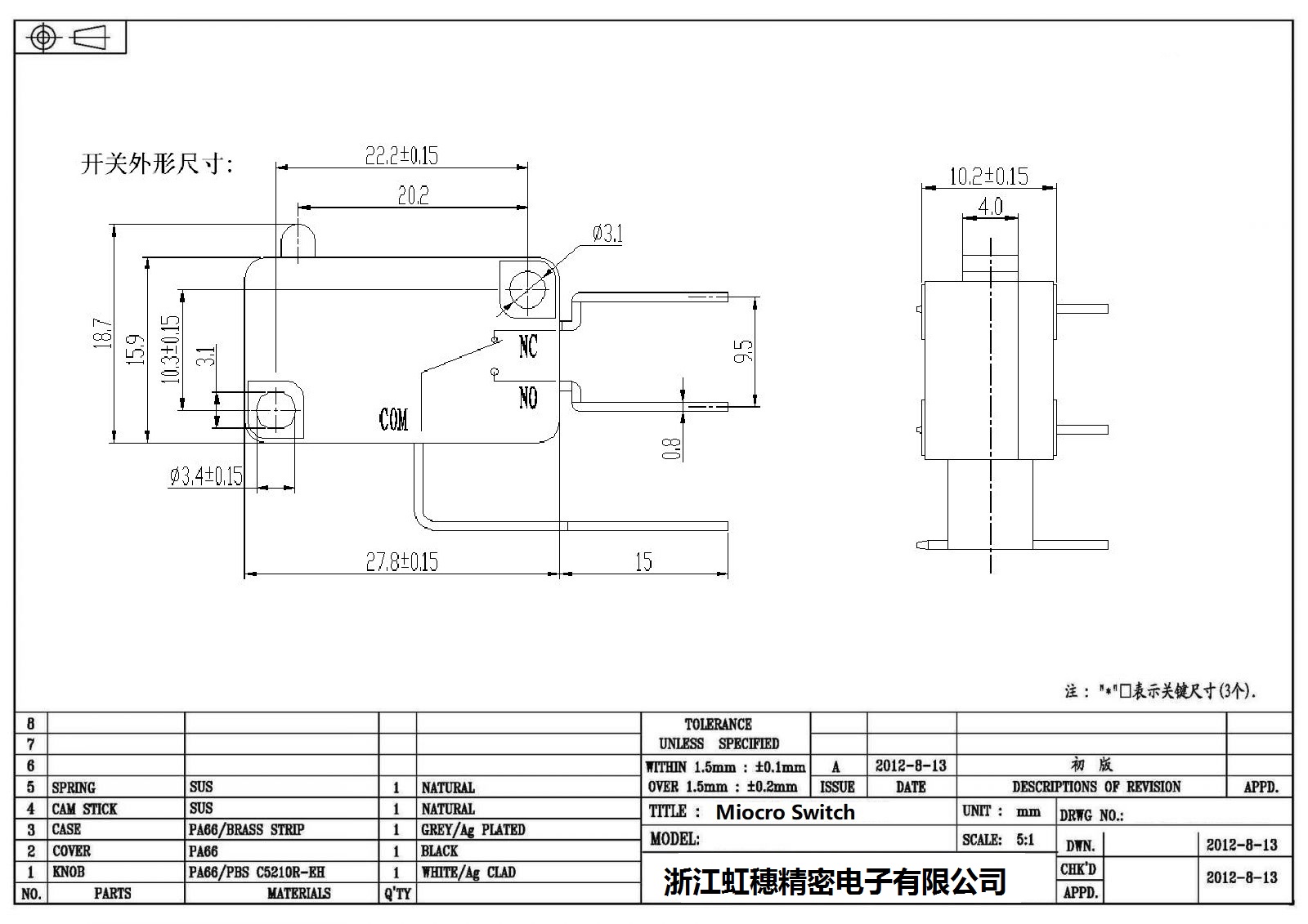 .請根據額定值電流、操作負載、驅動桿的種類、使用溫度等要求選擇合適型號的開關;