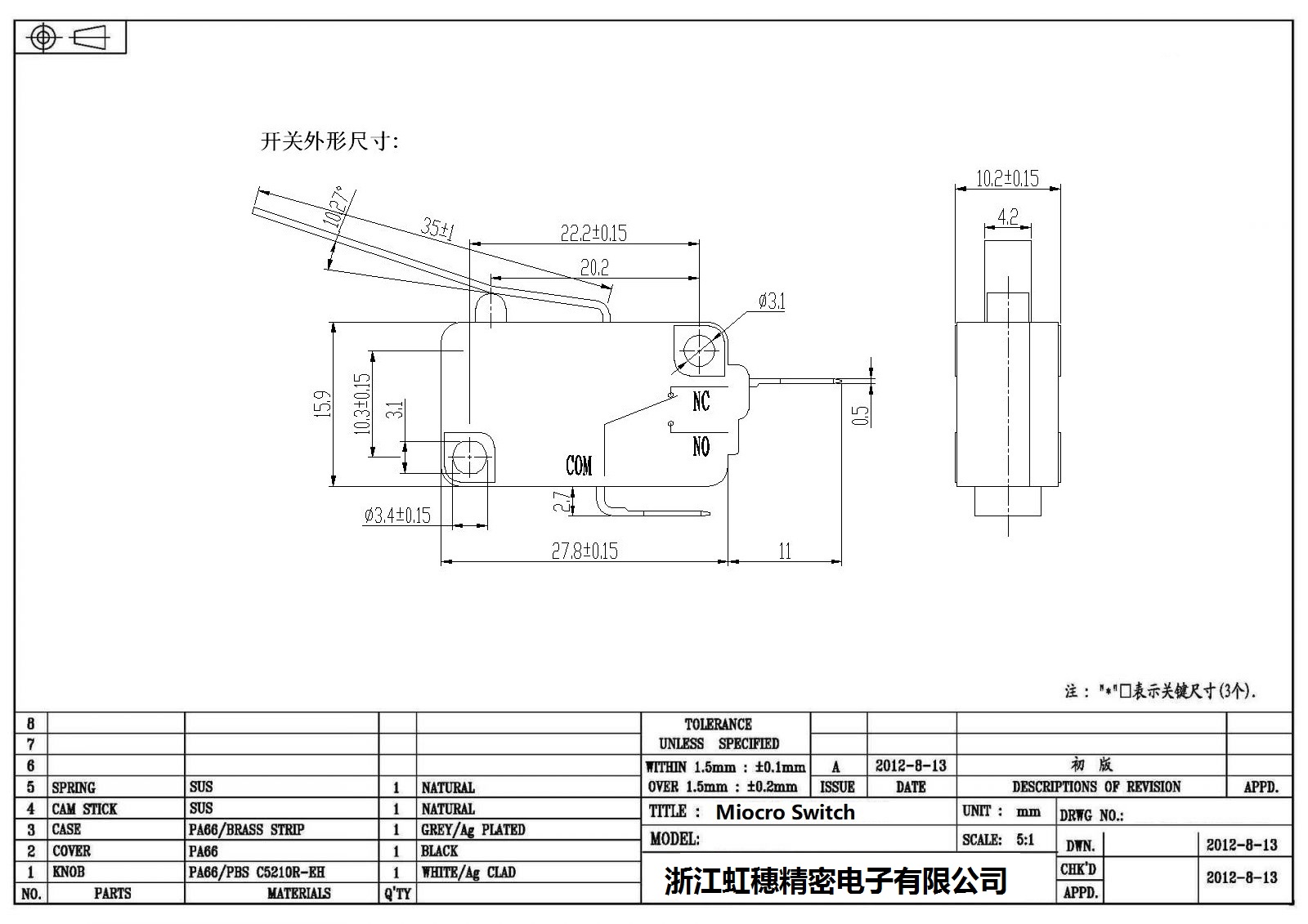 .請根據額定值電流、操作負載、驅動桿的種類、使用溫度等要求選擇合適型號的開關;