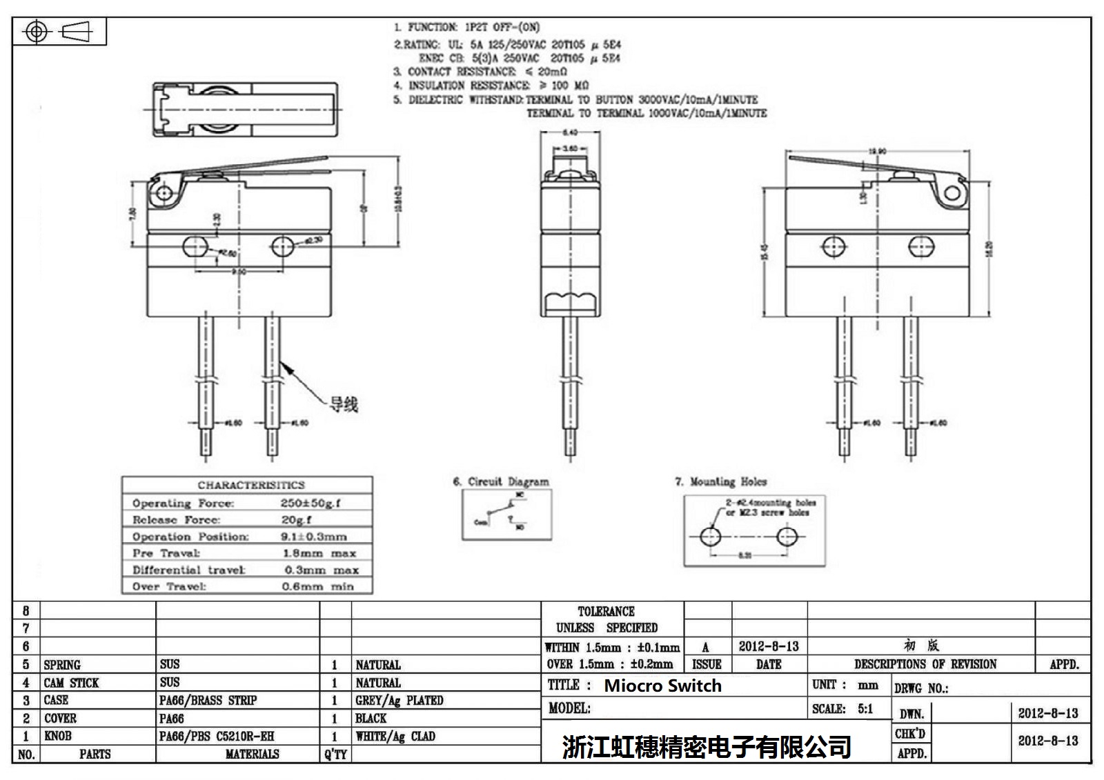 2.額定值:UL:5A125/250VAC 20T105 u 5E4