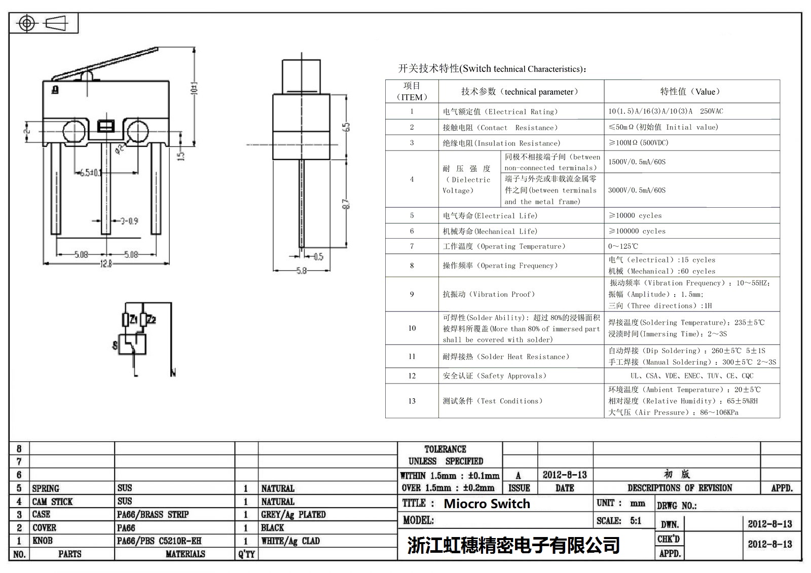 .請根據額定值電流、操作負載、驅動桿的種類、使用溫度等要求選擇合適型號的開關;