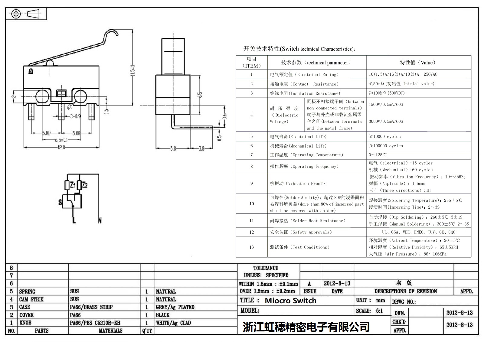.請根據額定值電流、操作負載、驅動桿的種類、使用溫度等要求選擇合適型號的開關;