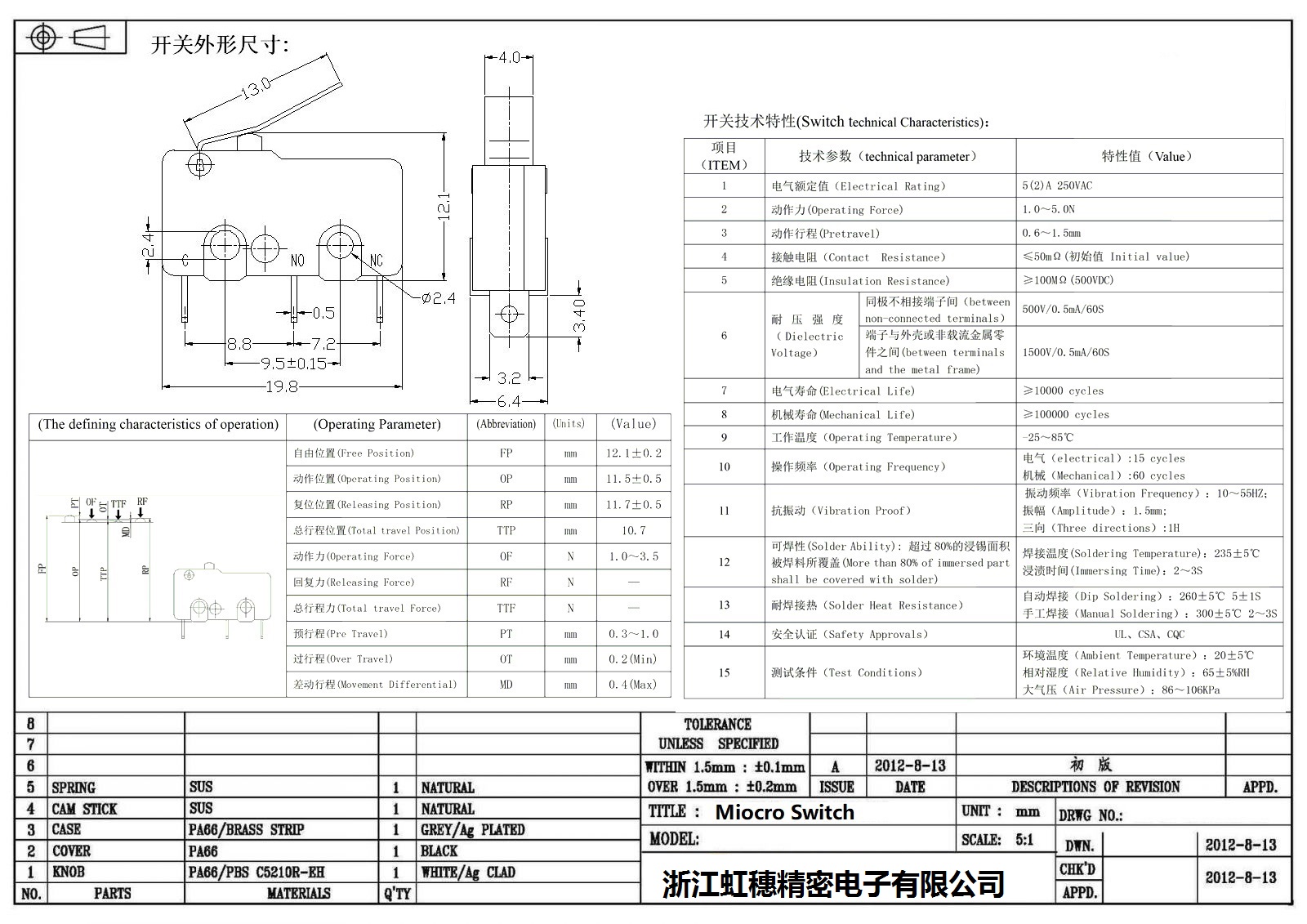 .請根據額定值電流、操作負載、驅動桿的種類、使用溫度等要求選擇合適型號的開關;
