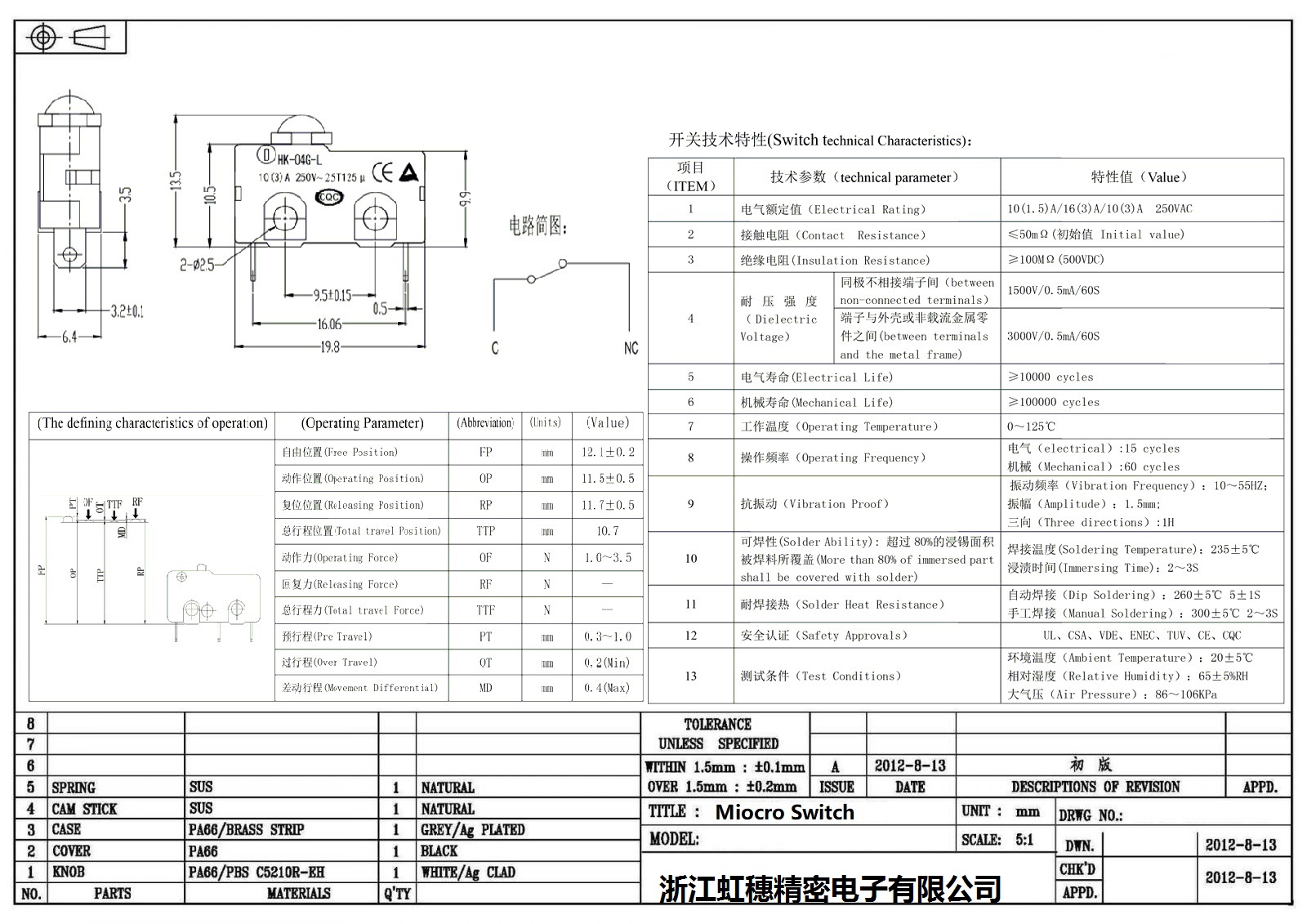 .請根據額定值電流、操作負載、驅動桿的種類、使用溫度等要求選擇合適型號的開關;