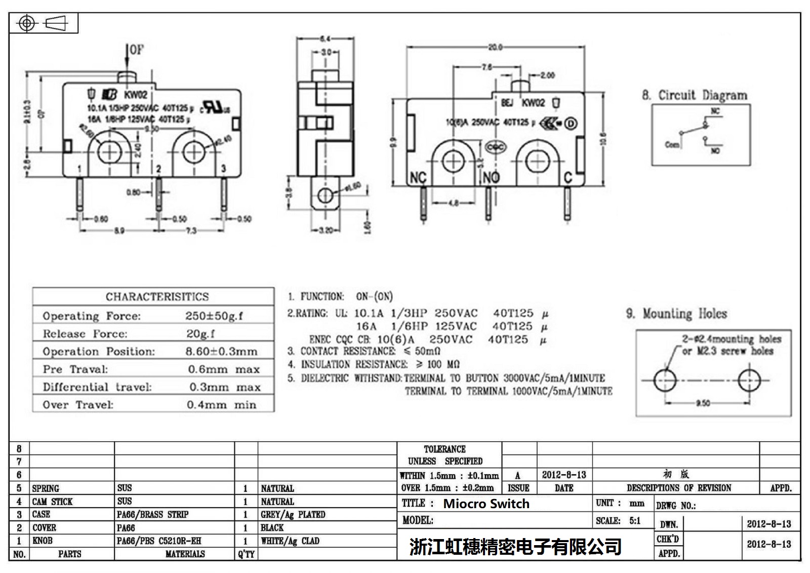 2.額定值:UL:5A125/250VAC 20T105 u 5E4