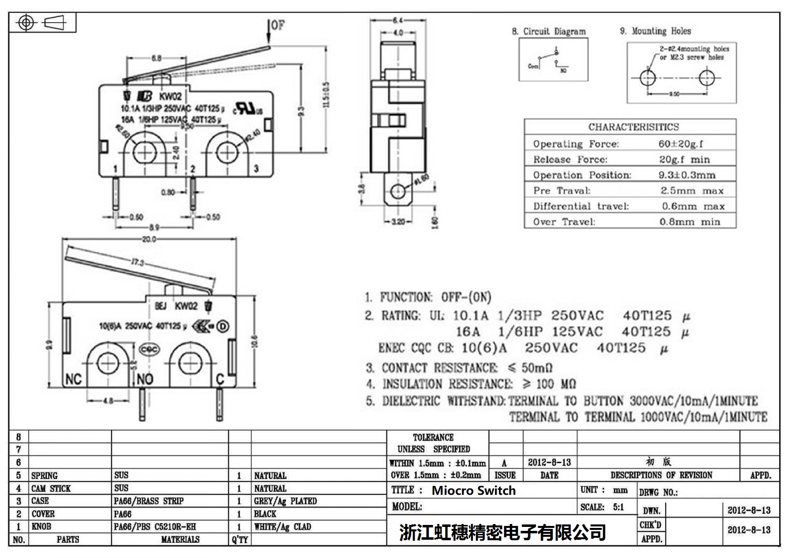 2.額定值:UL:5A125/250VAC 20T105 u 5E4