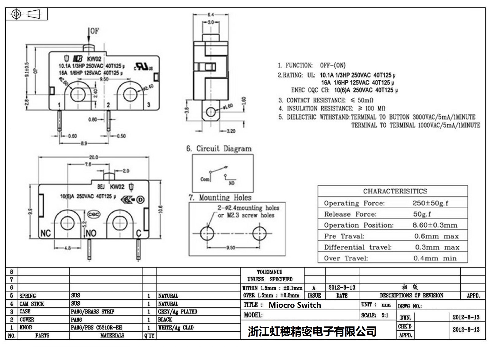 2.額定值:UL:5A125/250VAC 20T105 u 5E4