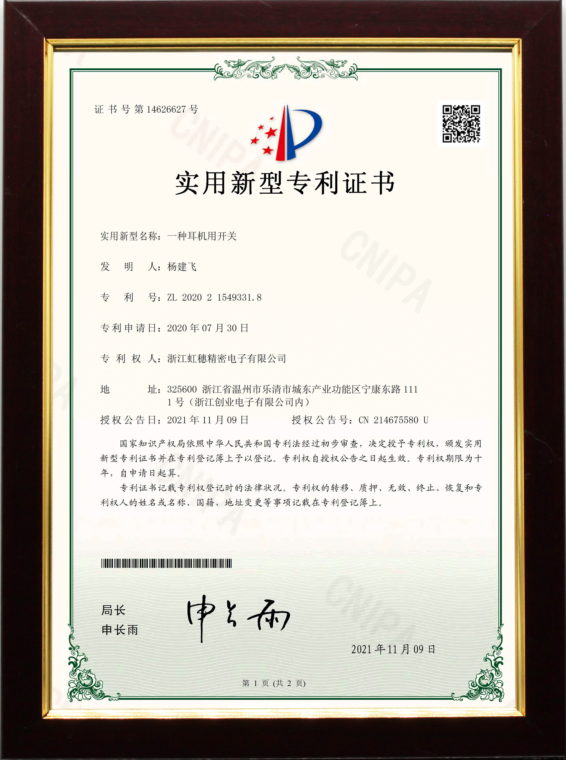 發(fā)明專利證書ZL201910267749.5